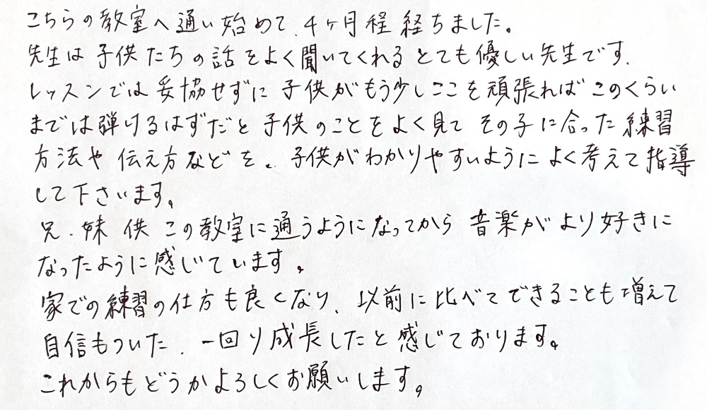 兄妹ともに、この教室に通うようになってから音楽がより好きになったように感じています。家での練習の仕方も良くなり、以前に比べてできることも増えて、自信もついた、一回り成長したと感じております。