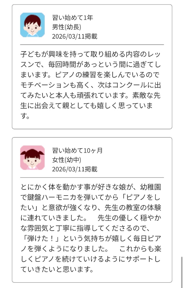 体験でもすぐにピアノを弾くことができて、子供も楽しそうにしていました。優しく教えてくださるので、スムーズにアドバイスを受け入れられたようです。