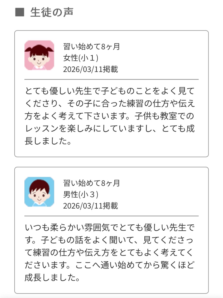 こちらの教室へ通い始めて、4ヶ月程経ちました。先生は子どもたちの話をよく聞いてくれるとても優しい先生です。
